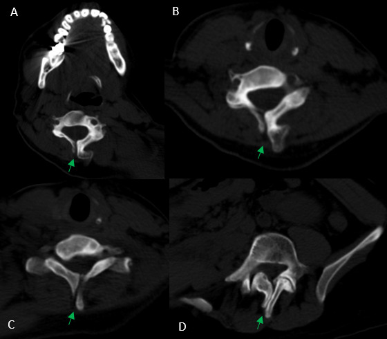 After analyzing the tomographic reports, the findings described in each of them were found in the cervical vertebrae (IMAGE 1), vertebral column (IMAGE 2), and abdomen (IMAGES 3 and 4). Karyotype report described in IMAGE 5.
