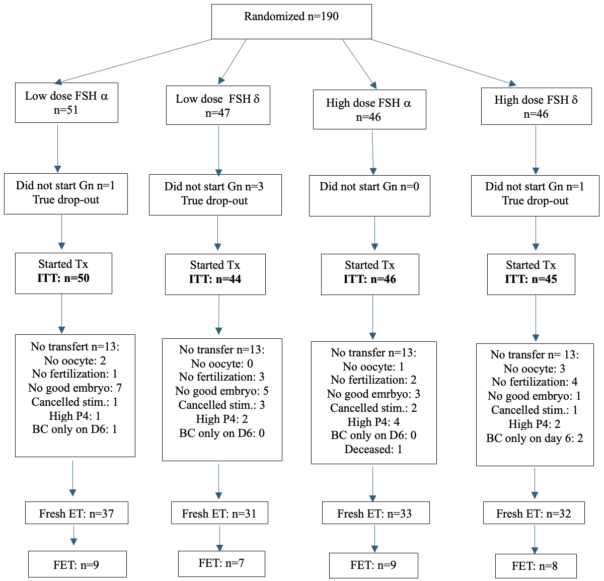 Of the planned 750 enrolled subjects, 190 were randomized (Figure 1). Fresh cycle embryo transfer took place in 133 patients: 68 in the lower dose FSH, while 65 in the higher dose FSH arms. (Figure 1).