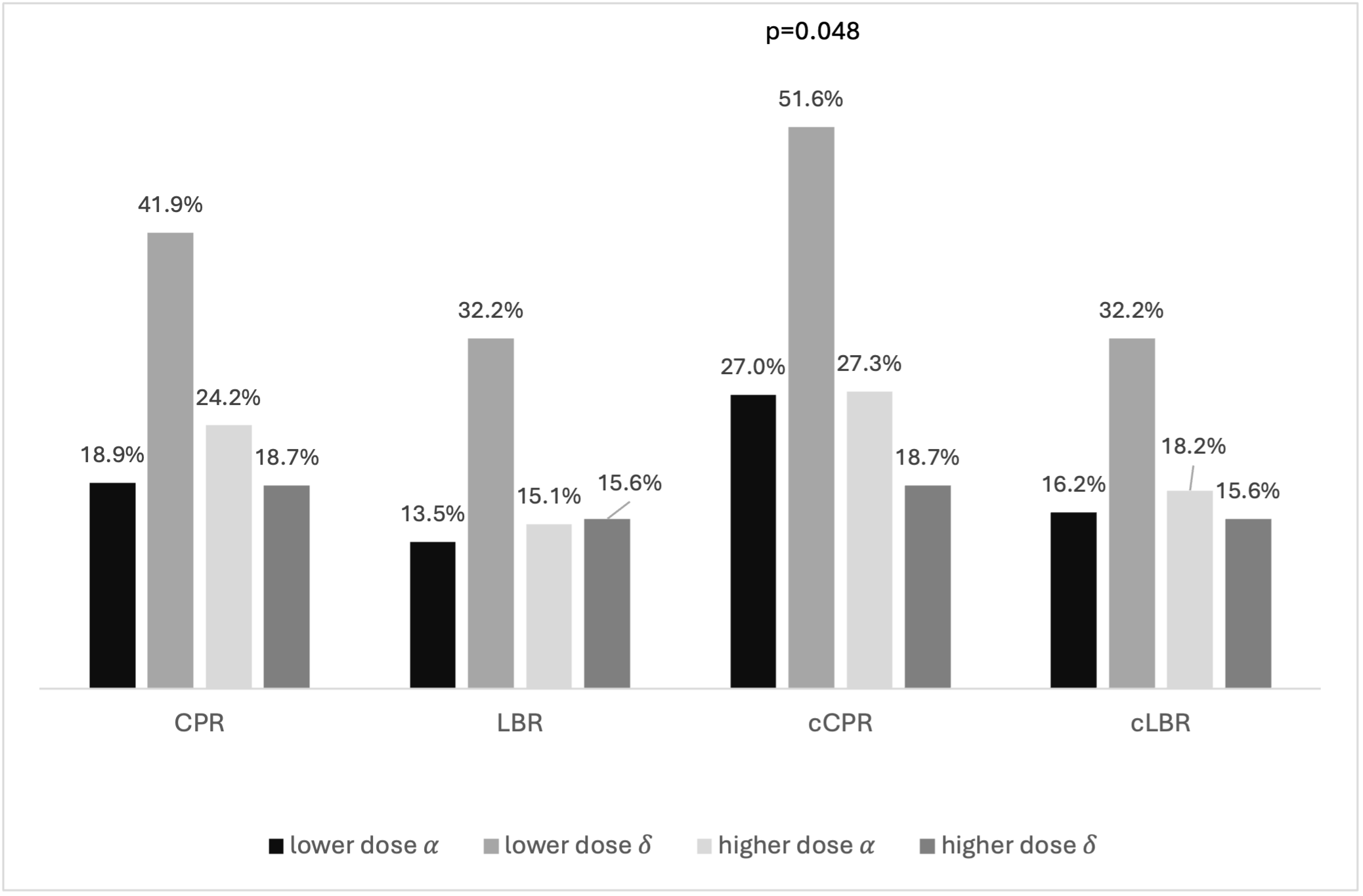 When outcomes were compared using different follitropin preparations (FSH-α vs δ), demographic characteristics, cycle stimulation, embryology parameters (Supplemental Table 1), and clinical outcomes (Figure 4) were comparable in the four subgroups. Regarding analysis for as treated cycles, while cCPR significantly differed (LD α: 27.0%, LD δ: 51.6%, HD α: 27.3%, HD δ:18,7%, p=0.048), this was not noted for cLBR. (Figure 4, 5)